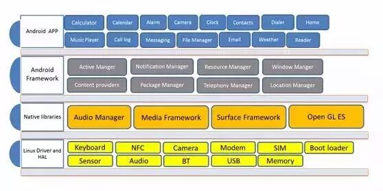 根据应用的场景不同,对于不同经验和层次的软件开发人员的需求也不一样。比如我们需要如下的Android技术框架,那么我们就需要在Android三个层级 (App,framework 和底层) 配备人手。如何调配“独立程序员”和普通程序员的人手比例也会更清楚。