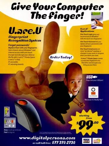 20世纪90年代,指纹识别设备开始进入消费市场,最初的产品类型为PC配件,如使用USB接口的U.are.U(1998年),可以让用户在登陆PC时不必再输入密码。2001年,曾经的PC巨头康柏推出了集成指纹识别功能的PC卡,让旧款笔记本也可支持指纹验证功能。